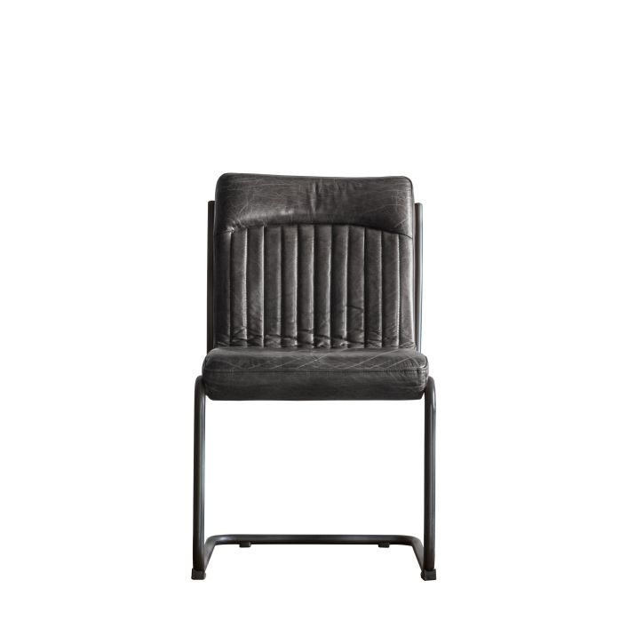 Contemporary dining or office chair with metal frame and top grain leather upholstery.