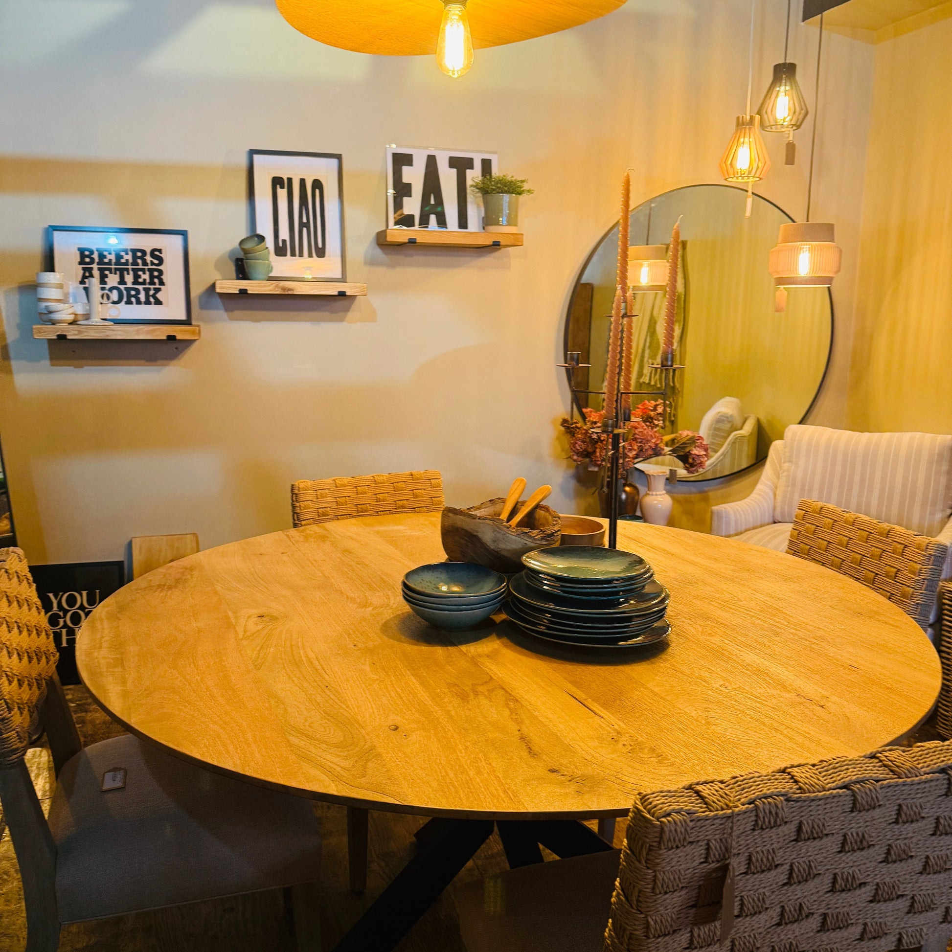 Made from Mango wood which has been sandblasted to give it a rustic effect. Paired with a black powder coated steel Spiderl eg.
